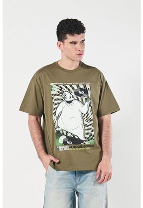 Camiseta oversize verde medio, manga corta para hombre, tiene cuello redondo, con estampado fotoluminescente en frente de The Nightmare Before Christmas. Dale un estilo diferente a tu vida y combina esta prenda en tus días casuales.