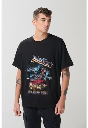 Camiseta cuello redondo negra para hombre cuenta con hombro rodado, manga corta, diseño en frente de Judas Priest y una silueta oversize en el cuerpo. ¡Esta prenda resaltará todo tu estilo moderno! Con un jean slim y un par de tenis casuales crearás una combinación con un ritmo auténtico.