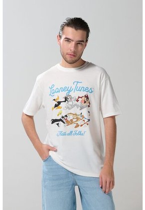 Camiseta crema clara cuello redondo para hombre cuenta con diseño de Looney Tunes estampado en frene, hombro rodado, manga corta y una horma que se ajustará al cuerpo en la medida precisa. Inspírate a crear una nueva versión de ti combinando esta prenda con jeans skinny, así serás la sensación con tu estilo contemporáneo.