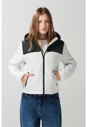 Chaqueta acolchada unicolor para mujer cuenta con corte en contraste en la parte superior, capota, cierre con cremallera en frente, 2 bolsillos y una silueta ajustada al cuerpo. Esta es una prenda infaltable para lucir en los días más fríos. ¡Con un jean mom o jegging te verás auténtica!