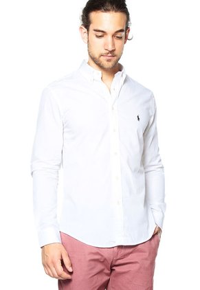 Camisa blanca Polo, confeccionada en algodón, diseño casual de textura suave, diseño a un solo tono y corte slim fit. Tiene cuello solapa estilo button down, manga larga de puño tradicional, cierre frontal en botones, logo de la marca a la altura del pecho que genera contraste y dobladillos en sus terminaciones.