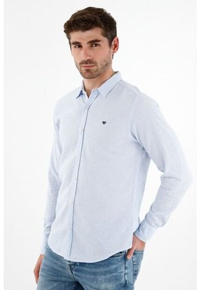 ¡Para tus planes más formales! Crea las combinaciones más llamativas de tu armario y destaca en tus planes importantes. Características- Color: azul - Cuello clásico - Manga larga - Diseño de rayas delgadas - Mini raqueta bordada en punto corazón - Perilla de botones en frente - Botón en puños - Material: Algodón 75% Lino 25% Sobre el fit Una camisa clásica que ya conoces y que amas gracias a su versatilidad.