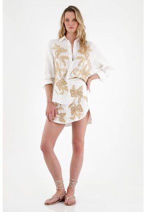 ¡A volar alto con tu estilo! Una camisa con los detalles más auténticos que le darán a tus looks clásicos un toque inolvidable. Características• Color: crudo • Cuello clásico • Manga larga • Ruedo curvo más largo en posterior • Bordado de mariposas en delantero • Perilla de botones • Puños con botón • Material: Lino 100% Sobre el fit Úsala con su falda en set y obtén un resultado elegante, formal y muy femenino.