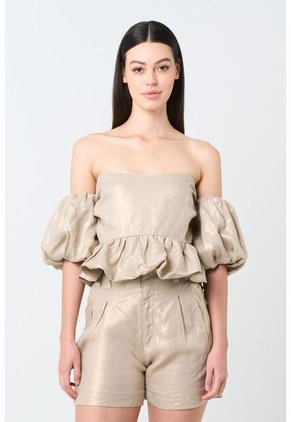 Con una silueta delicada y un toque romántico, esta blusa cropped en lino fusiona sensualidad y sofisticación en un diseño bohemio de alta calidad. El frente drapeado en un nudo crea un efecto único, mientras sus mangas abombadas y sin hombros aportan movimiento y feminidad. Perfecta para elevar cualquier outfit, es una pieza que destaca por sus detalles artesanales y su encanto atemporal.