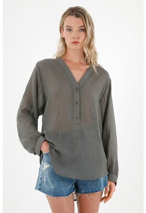 ¡Una prenda con un estilo único! Porque diferente también es cool. Características- Color: verde - Larga - Tela fluida con transparencia - Escote en V - Perilla de tres botones - Manga larga - Pieza en puño - Ruedo semicurvo - Ruedo posterior más largo - Material: Poliéster 65% Algodón 35% Sobre el fit Su silueta amplia la hace súper única y llamativa, para que crees los looks más novedosos.