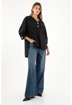 ¡Tan formal como desees y tan casual como la combines! Una camisa que te podrá acompañar en toda ocasión y con la que siempre te sentirás bien. Características- Color: negro - Manga ranglan 3/4 - Cuello clásico - Tapas decorativas en frente - Media perilla de botones en frente - Aberturas en costados - Material: Algodón 100% Sobre el fit Una silueta amplia que te permitirá moverte con tranquilidad mientras te sientes preciosa.