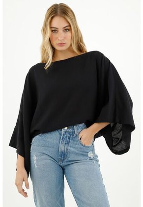 ¡Sin límites! Una camisa con infinitas posibilidades para combinarla en tu día a día. Características- Color: negro - Manga 3/4 amplia - Cuello bandeja - Material: Algodón 100% Sobre el fit Su estilo oversize te dará libertad de movimiento y frescura máxima de domingo a domingo.