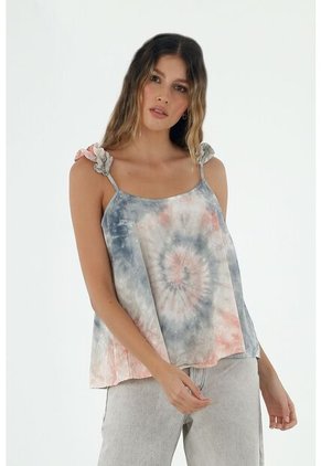 Moderna y totalmente femenina: el delicado detalle en los hombros le aporta un toque primaveral a esta camisa en popelina con motivos tie dye full cobertura. - Camisa de mujer. - Silueta amplia. - Diseño con cuello redondo, de tiras. - Boleros decorativos sobre los hombros. - Espalda con escote redondo. - Manchones intencionales en caracol a través de procesos de teñido tie dye, que pueden variar en tono e intensidad.- Cada prenda es única.