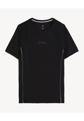 Camiseta deportiva de manga corta con cuello redondo y estampado tipográfico sutil al frente, diseñada para aportar actitud y enfoque a looks activos, su silueta cómoda y detalles laterales elevan una prenda pensada para entrenar, moverse o vivir el día con una vibra urbana y funcional.Especificaciones:Color: NegroComposición: Poliéster 84% Elastano 14% Poliamida 2%Tipo de cuello: Cuello RedondoTipo de manga: Manga CortaFit: RegularInstrucciones de Lavado:No dejar en remojoLavar en agua fría separadamenteNo usar blanqueadorNo retorcerSecar a la SombraPlancha tibiaHecho en ColombiaGarantía: 30 Días.