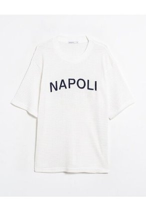 Camiseta de silueta Oversize con cuello redondo y mangas cortas, presenta textura sutil y un texto frontal Napoli que aporta un aire urbano y actual. Una prenda fácil de combinar que funciona en looks casuales o en capas para el día a día.Especificaciones:Color: MarfilComposición: Poliéster 65% Algodón 35%Tipo de cuello: Cuello RedondoTipo de manga: Manga CortaFit: OversizeInstrucciones de Lavado:No dejar en remojoLavar en agua fría separadamenteNo usar blanqueadorNo retorcerSecar a la SombraPlancha tibiaHecho en ColombiaGarantía: 30 Días.
