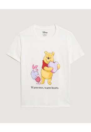 Camiseta para mujer. Manga corta. Cuello redondo clásico. Estampado frontal de Winnie Pooh y Piglet sosteniendo corazones. Ilustración colorida de licencia Disney. Mensaje gráfico Warm toes warm hearts. Ajuste cómodo para uso diario.Especificaciones:Color: CremaComposición: Algodón 100%Tipo de cuello: Cuello RedondoTipo de manga: Manga CortaInstrucciones de Lavado:No dejar en remojoLavar en agua fría separadamenteNo usar blanqueadorNo retorcerSecar a la SombraPlancha tibiaHecho en ColombiaGarantía: 30 Días.
