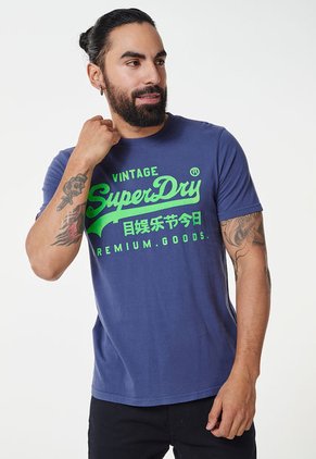 Camiseta Azul Navy-Verde Neón Superdry Vintage Logo Neon