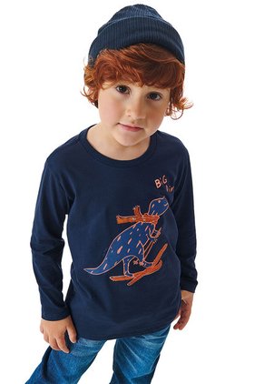 A los chicos les encantará la aventura, al igual que sus amigos dinosaurios esquiando. Una camiseta manga larga con diseño bordado en la parte frontal en contraste, lentejuelas naranjas, suave al tacto, cuello redondo y bordes finamente reforzados. Ideal para combinarlo con pantalones o bermudas de diferente color.