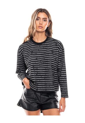 Camiseta de manga larga y cuello redondo, con detalle de estampado a rayas en plateado. Esta prenda está hecha con el corazón por manos Colombianas.
