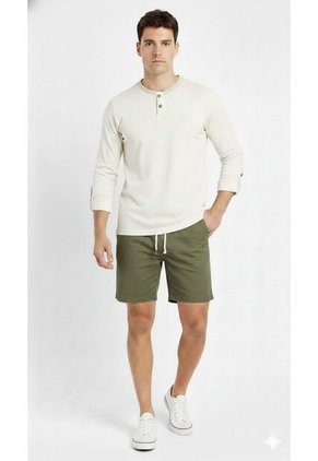 Camiseta para hombre en tono ivory, de manga larga con broche para remangar, cuello redondo tipo Henley y perilla funcional con botones. Confeccionada en una tela con textura que aporta un acabado moderno y elegante. Una prenda versátil y cómoda para looks casuales con un toque refinado.