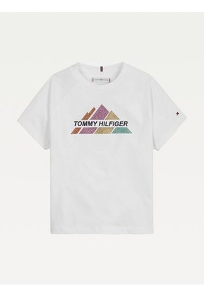 Camiseta Niña Manga Corta Blanco Glitter EstampadoEste camiseta con estilos distintivos cuenta Características Tipo de Manga: manga cortaComposición: elaborado en 50% algodon 50% poliestertejido en puntoCodigo del articulo: KG0KG06167-YBR