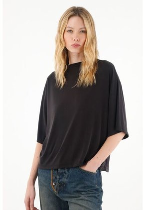 ¡Tu nueva infaltable! No encontrarás una prenda más versátil y estilizada para tus días de oficina. Características- Color: negro - Manga corta - Cuello alto - De tacto suave - Material: Modal 70% Poliéster 30% Sobre el fit Su estilo oversize te dará libertad de movimiento y toda la frescura que buscas al momento de complementar tus looks en verano.