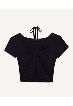 Camiseta con escote en v y anudado para mujer, cut out en el centro, tiras para ajustar en el pecho y el cuello, manga corta, textura acanalada, tipo crop, úsala con jeans de diferentes estilos, faldas o shorts. Hecha en tela nailon y elastano. ¡llévala agregándola al carrito de compras!Especificaciones:Manga CortaColor NegroComposición: Nailon 90% Elastano 10% Instrucciones de Lavado:No dejar en remojoLavar en agua fría separadamenteNo usar blanqueadorNo retorcerSecar a la SombraPlancha tibiaHecho en ColombiaFabricado por: Manufacturas Eliot SAS