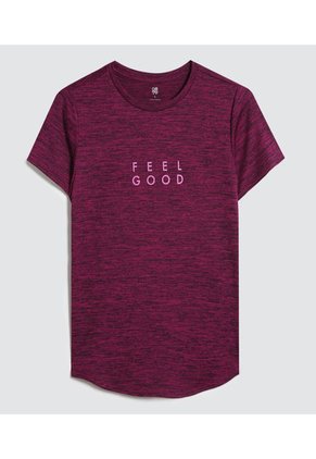 Camiseta deportiva para mujer con estampado al frente, color morado, cuello redondo, textura lisa, diseño jaspeado, manga corta, silueta amplia. Su tela cuenta con tecnología SPORT SEC acabado que permite absorber y expulsar la humedad, gracias a la estructura de sus fibras que facilitan la rápida evaporación y secado. Hecha en poliéster, poliamida y elastano.Especificaciones:Color Fucsia JaspeComposición: 48% Poliéster 47% Poliamida 5% ElastanoInstrucciones de Lavado:No dejar en remojoLavar en agua fría separadamenteNo usar blanqueadorNo retorcerSecar a la SombraPlancha tibiaHecho en ColombiaFabricado por: Manufacturas Eliot SAS