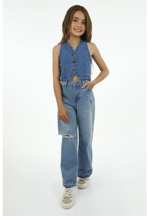 ¡Looks total denim para tu pequeña! Este chaleco de tono medio tiene un diseño muy moderno de botones delanteros, corto, cuello en V y manga sisa. En definitiva, una tercera prenda infaltable. Características- Color: azul medio - Manga sisa - Silueta regular - Material: 79 % algodón, 19 % poliéster y 2 % elastano. Sobre el fitEste chaleco es corto y de silueta regular, su diseño quedará muy bien con jeans de tiro alto y camisetas básicas por debajo.