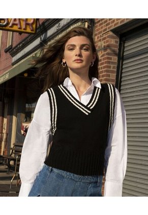 Chaleco para mujer tejido con detalle de rayas, en contraste en cuello y sisas, y tipo "college". Chaleco Cuello V Con Detalles En Contraste Para MujerChalecoFit: N/AColor: NegroComposición: Algodón 60% Acrilica 40% INSTRUCCIONES DE LAVADO:No dejar en remojoLavar en agua fría separadamenteNo usar blanqueadorNo retorcerSecar a la sombraPlancha tibia