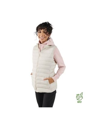Chaleco acolchado para mujer Colorvest, confeccionado con relleno RPET para un estilo sostenible y cómodo. Equipado con una bolsa plegable para mayor practicidad y bolsillos internos junto con bolsillos laterales con cremallera para guardar tus objetos personales de manera segura. Este chaleco es ideal para complementar tus outfits diarios.