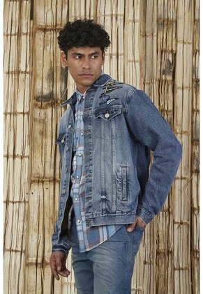 ¡La nuestra! Esta chaqueta azul con lavado de tono medio oscuro cuenta con desgastes y costuras con reserva en la parte frontal. Tiene parches adelante y bordado de cóndor en posterior a mano; representando nuestro origen y lo hecho en casa. Características- Color: azul - Cuello normal - Manga larga - Silueta regular - Material: 100 % algodón. Sobre el fit De silueta y corte regular, esta chaqueta se adapta a todos los tipos de cuerpo sin quedar muy apretada. Su perilla con botones te permitirá llevarla abierta o cerrada y combinarla con otras prendas para crear un look de capas súper cool.