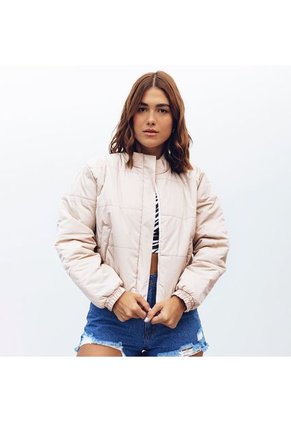-Chaqueta bomber acolchada -Cuello alto -Cierre y broches en frente -Silueta crop -Con elastico en ruedos y punos -Tejido plano impermeable forrado Material: POLIESTER 100%