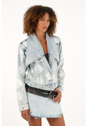 ¡¿Lista para brillar?! Esta chaqueta de corte elegante y detalles vanguardistas es todo lo que necesitas para destacar en un día cotidiano. Características- Color: azul - Chaqueta - Crop - Tono ice - Estampados con apliques en canutillos blancos - Cuello tipo solapa - Ajuste de botones en delantero - Material: Algodón 100% Sobre el fit Una silueta diseñada para elevar cualquier look sin perder comodidad.