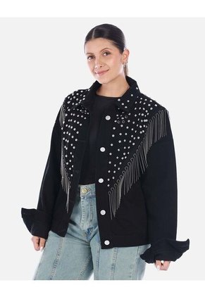 Chaqueta Diosa Denim Con Taches Y Flecos