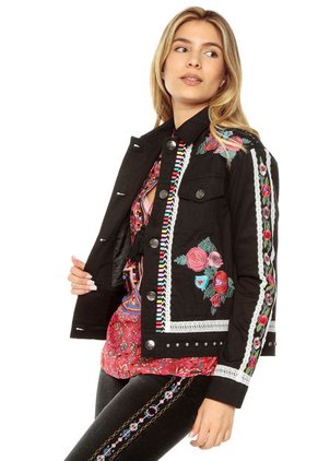 • Detalle Especial: Prenda con bordados florales multicolor, detalles tipo taches en los hombros, bolsillos frontales con bordes reforzados.