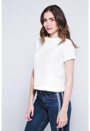 Busos para mujer, en tela unicolor, afelpado, cerrado, con cuelo redondo, mangas cortas y silueta corta.
