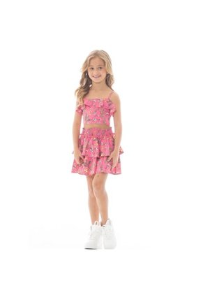 Conjunto crop top y falda short floral de color rosado para niñas. ¡Perfecto para días de verano! ¡Luce hermosa con este outfit!