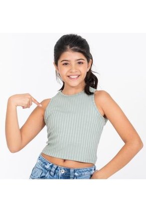 Crop top en rib de color verde. ¡Básica infaltable para tus outfits Nauty Blue! ¡Luce hermosa con este outfit! Crop top de cuello redondo con manga sisa