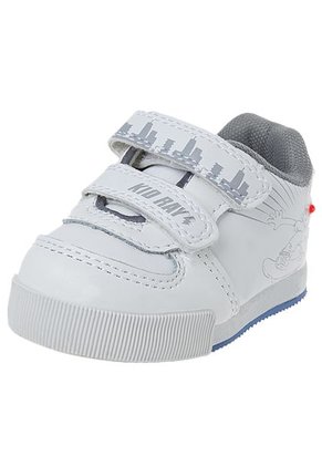 Deportivos Colloky luminosos de color blanco, material exterior en sintético y cuero, tiene unas correas en velcro para un fácil ajuste la correa inferior tiene diseño de Colloky- Kid Ray, unos tenis que tienen unas figuras impresas en el borde externo y en la correa superior, tienen un sistema que a los niños les va a encantar, en un ojo de Kid Ray y en la parte de atrás posee una luz que se activa con cada pisada. ¡Genial!, esta forrado en textil gris y tiene la suela en goma azul. Unos tenis muy divertidos y muy cómodos en sus primeros pasos.