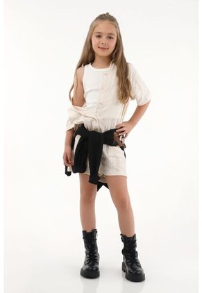 ¡Libre y cool! Una prenda delicada que transmite frescura y ligereza, perfecta para sus días más divertidos. Características - Color: crudo - Enterizo corto - Cuello camisero - Manga corta - Perilla con botones en frente - Bolsillos de parche en delantero - Material: Algodón 100% Sobre el fit Para tus momentos más creativos, este enterizo será perfecto con tenis o sandalias.