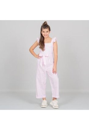 Enterizo largo NAUTY BLUE para niñas, rosado claro, con: cargaderas con boleros, recogido en nido de abeja en la espalda y cinturón para amarrar.