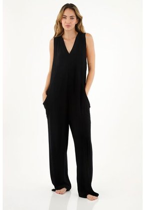 ¡Todo lo que amas en una sola prenda! El look perfecto te está esperando de la mano de este enterizo. Características- Color: negro - Escote en V - Manga sisa - Tela fluida - Pantalón largo - Bolsillos laterales - Material: Viscosa 95% Elastano 5% Sobre el fit De silueta amplia para que te sientas cómoda y puedas moverte con tranquilidad.
