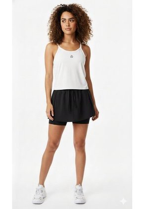 Falda deportiva para mujer en color negro, elaborada en tejido plano con bolsillos funcionales. Incorpora ciclista interno y pretina con elástico que brinda ajuste cómodo y seguridad durante el movimiento. Una prenda práctica y versátil pensada para entrenamientos activos.
