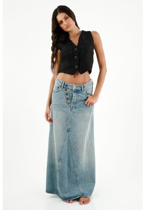¡Viste el amor en denim! Los detalles clásicos que te gustan y la esencia retro se unen para enamorarte con esta prenda que diseñamos pensando en ti y en tus looks de semana. Características- Color: azul - Larga - En denim - Cinco bolsillos - Pretina asimétrica para ponerla baja o alta con ajuste de botones - Material: Algodón 100% Sobre el fit Llévala como más te guste y combínala con tenis o botas texanas, según la ocasión.