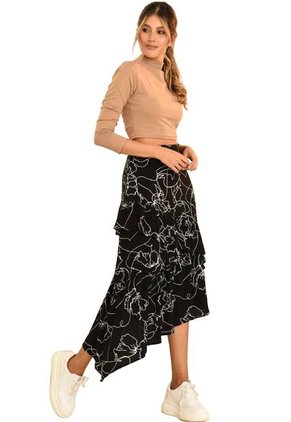 Falda larga en chalis estampado, cierre en costado, boleros asimétricos, forro interno en chalis fondo entero.