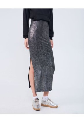 Falda larga para mujer, unicolor con abertura lateral y efecto metalizado. Diseño en tendencia que puedes usar para darle versatilidad a tus looks casuales. Hecha en poliéster y elastano.Especificaciones:Modelo: MedioColor: NegroComposición: 87% Poliéster 13% ElastanoInstrucciones de Lavado:No dejar en remojoLavar en agua fría separadamenteNo usar blanqueadorNo retorcerSecar a la SombraPlancha tibiaHecho en ColombiaFabricado por: Manufacturas Eliot SAS
