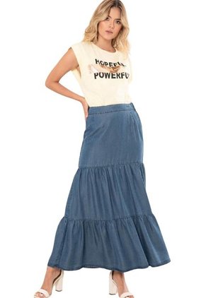 Falda larga en denim liviano fondo entero con proceso de lavado tono medio, pretina con cierre en costados. Silueta amplia.