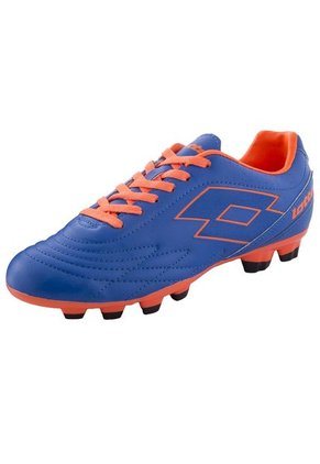 Guayos de Fútbol Lotto color azul y naranja, confeccionados en material sintético, poseen costuras visibles; finas y de excelente durabilidad, la punta redonda garantiza el confort frente a impactos debido a sus revestimientos semi-acochados, el empeine es acordonado, de cordones contraste, logotipo troquelado en alto y bajo relieve, cuello moldeado y acolchado el cual permite pleno confort durante los movimientos. Forrados en sintético, con una plantilla extraíble. La suela maneja tacos ubicados estratégicamente y adecuados para aumentar el agarre en terrenos sintéticos o naturales. Lo mejor del deporte se vive con Lotto.