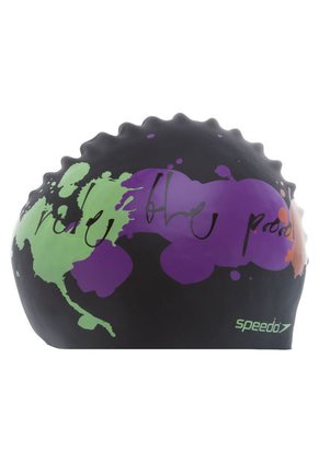 Gorro Speedo Slogan Print color negro, elaborado en silicona,