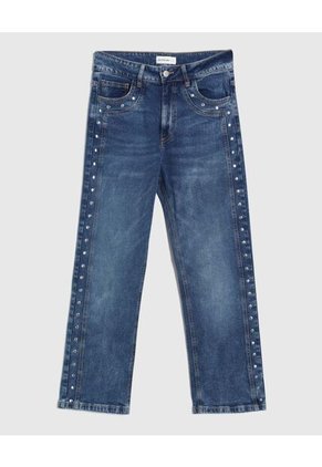 Jean para mujer,Silueta de bota recta,Tiro medio-alto,Decoración con apliques metálicos tipo estoperoles en los costados,Cinco bolsillos funcionales,Cierre frontal con cremallera y botón,Pasadores para cinturón en la pretina,Tejido denim con efectos de lavado ligeroEspecificaciones:Color: AzulComposición: Tela Primaria:Algodón 99% Elastano 1% Tela Secundaria:Algodon 50% Poliéster 50%Fit: StraightTiro: MedioInstrucciones de Lavado:No dejar en remojoLavar en agua fría separadamenteNo usar blanqueadorNo retorcerSecar a la SombraPlancha tibiaHecho en ColombiaGarantía: 30 Días.