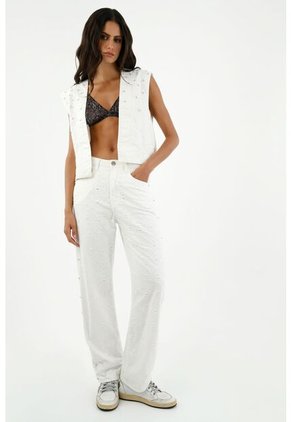 ¡Justo cuando creíste que no había un jean con detalles más lindos! Esencial para que luzcas diferente y le des un nuevo aire a tus outfits. Características• Color: crudo • Cinco bolsillos • Silueta recta • Efecto de textura en láser frontal • Piedras decorativas en costados – Cintura con pretina • Material: Algodón 100% Sobre el fit Ideal para combinar con prendas vibrantes y camisas más ceñidas.