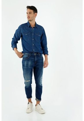 ¡Este jean hará que domines a la perfección el street style de esta temporada! Su corte moderno, el destroyed localizado y el efecto desgaste suave convierten a esta prenda en la ideal para salir de paseo por la ciudad.Características-Tono medio - Silueta: moderna - Cintura con pretina - Material: 100% algodón - 5 bolsillos - Destroyed localizadoSobre el fitLa silueta de este jean es semi amplia en la parte de la cadera y ajustada en la bota. Es perfecto para los amantes del algodón ya que está confeccionado 100% en este material. Complementa tu look con una chaqueta de cuero.