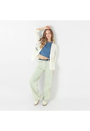 JEAN 5 BOLSILLOS MOMFIT AZUL CLARO CON DIRTY BEIGE BOTA RECTA CON CINTURON Y HERRAJE EN CENTRO POSTERIOR