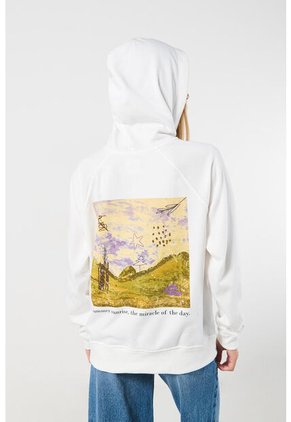 Buzo con capota crema claro para mujer cuenta con diseños de paisaje artístico localizados, puños y ruedo en rib, manga ranglan, cordón para anudar, bolsillo delantero y una silueta holgada al cuerpo. Dale una pincelada de estilo a tu look combinando esta prenda con tus jeans o faldas preferidas. ¡Te destacarás en todo momento!
